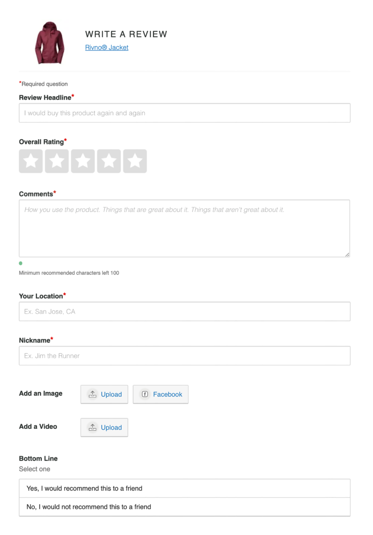 Rating, headline, comments, nickname, location. These are the basics. Think of these questions as the foundation from which all review collection forms are built.