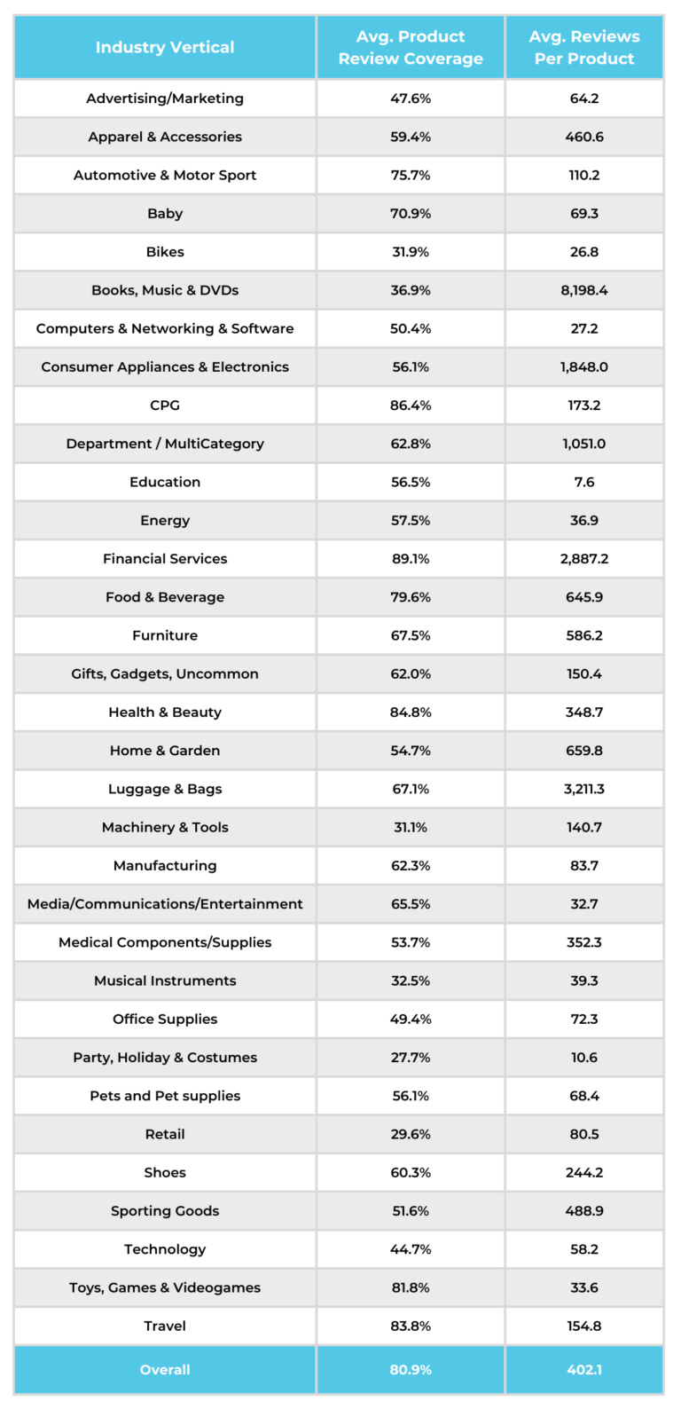 To benchmark review volume, we analyzed overall review coverage (how many products have at least 1 review) and review coverage per product (the average number of reviews per product). The average review coverage across verticals is 80.9%, with 402.1 reviews, on average, for each product.
