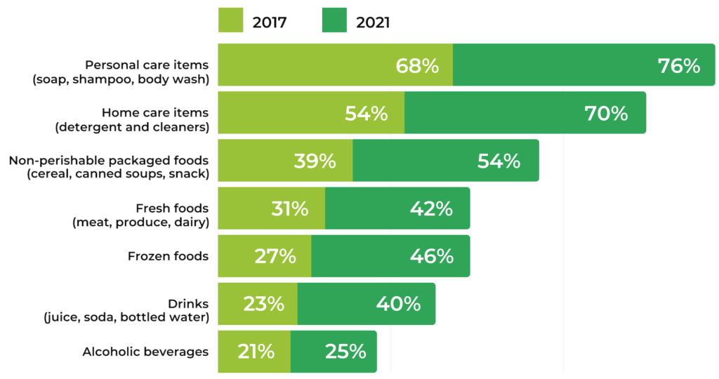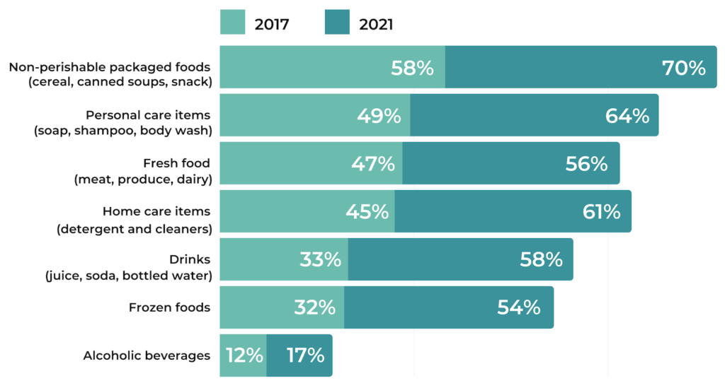And that’s still the case. 70% of online shoppers indicate they’ve purchased non-perishable packaged foods online. Other popular product categories for online grocery shopping are personal care items (64%), home care items (61%) and soft drinks (58%).