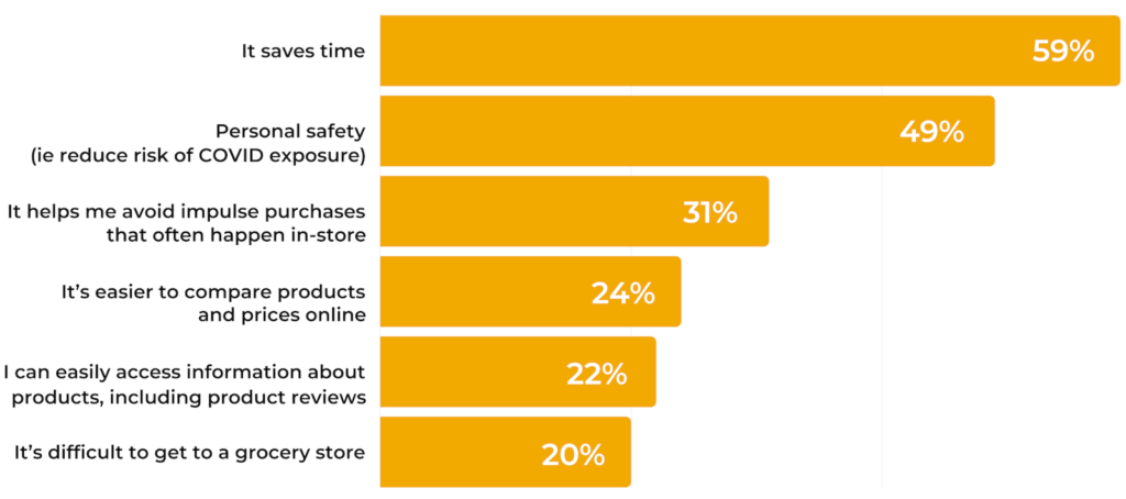 Time savings is the most popular reason. 59% of consumers indicate it’s a key reason they choose to purchase groceries online, which indicates that the trend is likely to stick post Covid. And 49% say they purchase groceries online for personal safety reasons, which makes sense in the midst of the ongoing pandemic.