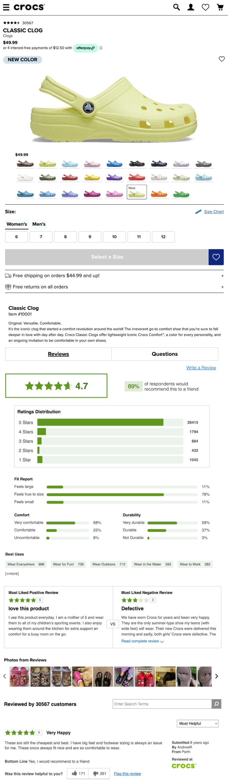 Research from Baymard tells us that users rely more on the ratings distribution summary than the individual reviews. But nearly half of ecommerce sites don’t have such a summary. And of those that do include a distribution summary, 39% aren’t clickable.