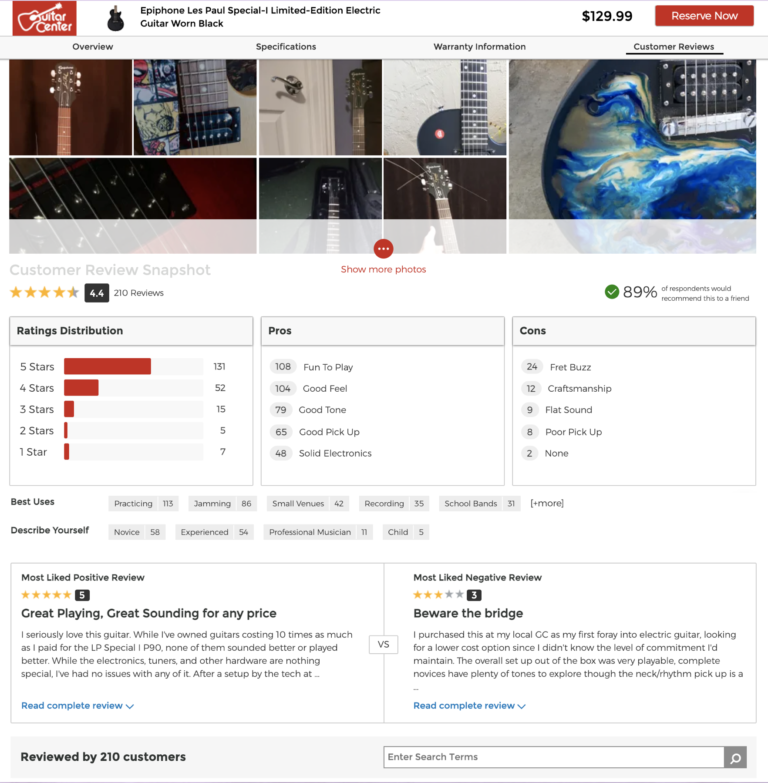 In this example, the shopper can see the average star rating, the number of reviews, the percentage of customers who would recommend the product, and how the reviews are distributed among the different star ratings. Visitors can click on each star rating to see only the reviews with that particular star rating. This particular snapshot also lets shoppers see the most liked positive review alongside the most liked negative review, which is a great way for visitors to quickly understand the upsides and downsides of this product. They can also quickly see the pros, cons, and best uses and click on any of those categories to see the reviews that speak to these features.