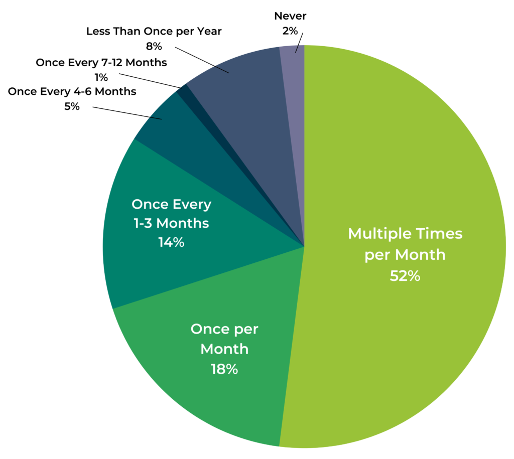 Our research found that about half of consumers (52% to be exact) write reviews multiple times per month. The other half submit this content far less frequently –and 2% never do.
