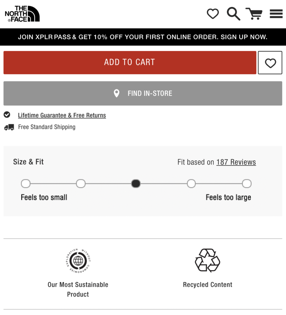 Remember to markup other images on your page beyond the product gallery. For example, The North Face has alt text for the two icons on their product page: “our most sustainable product” and “recycled content.” Adding alt text to these images may encourage Google to show their product when people are searching for sustainable clothing.