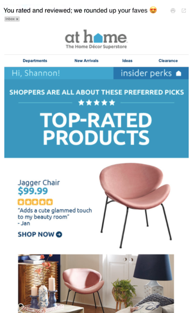 This example from At Home is one of our favorites. They sent out an email with a subject line that read “You rated and reviewed; we rounded up your faves.” Talk about building intrigue! The call-to-action-based subject line invites people to open the email and take a look. The email itself featured top-rated products with star ratings and snippets from 5-star reviews.