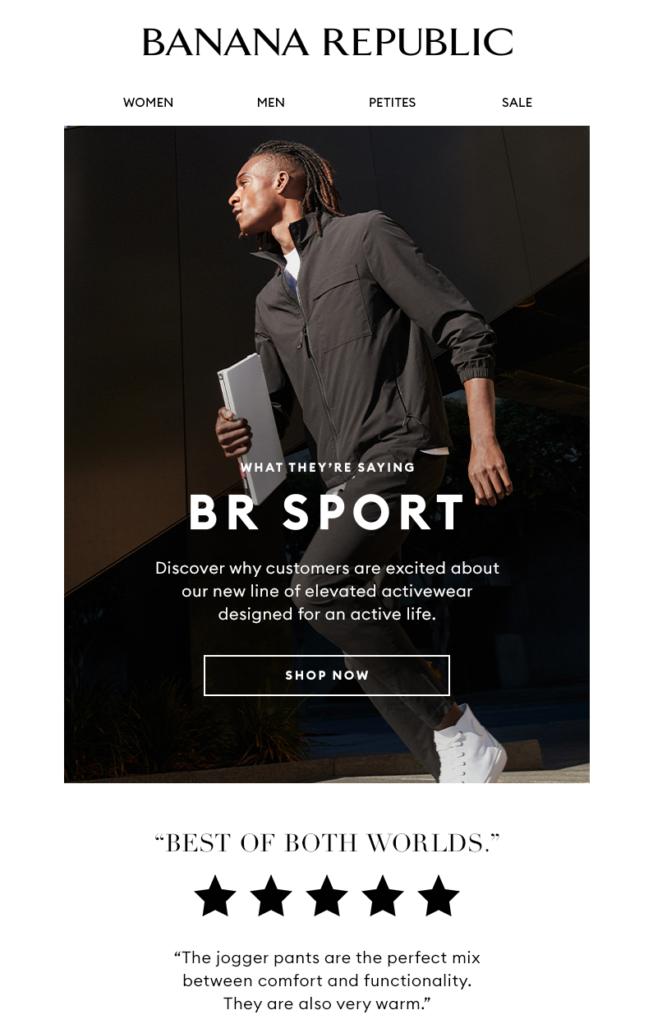 Incorporating reviews in your product launch is a great way to get buy-in. Get customers excited about your new product by telling them what other people think, like this example from Banana Republic.
