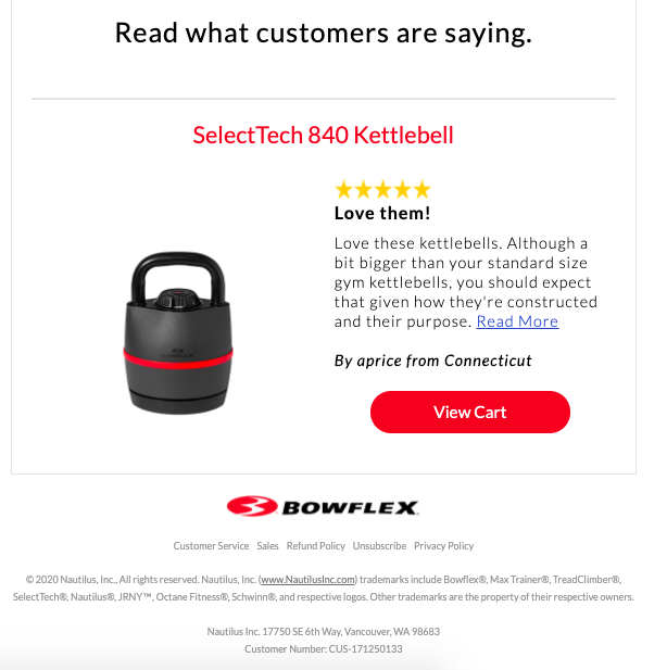 For some shoppers, a visual reminder of the items they had in their cart might be enough to convince them to come back and buy. But many shoppers will need something more persuasive — like a 5-star review from a real customer. Here’s an example from Bowflex.