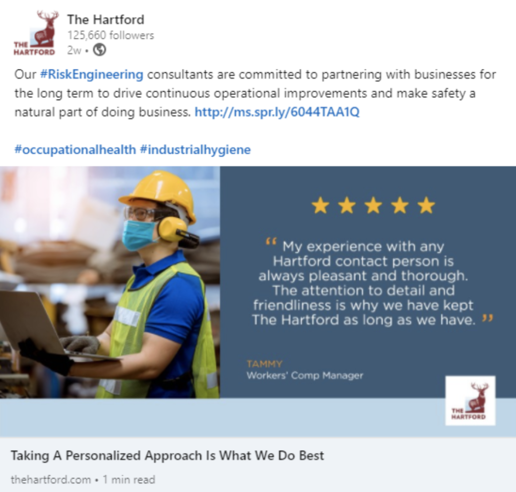 That’s right. You can even use reviews on LinkedIn. Just take a cue from The Hartford.