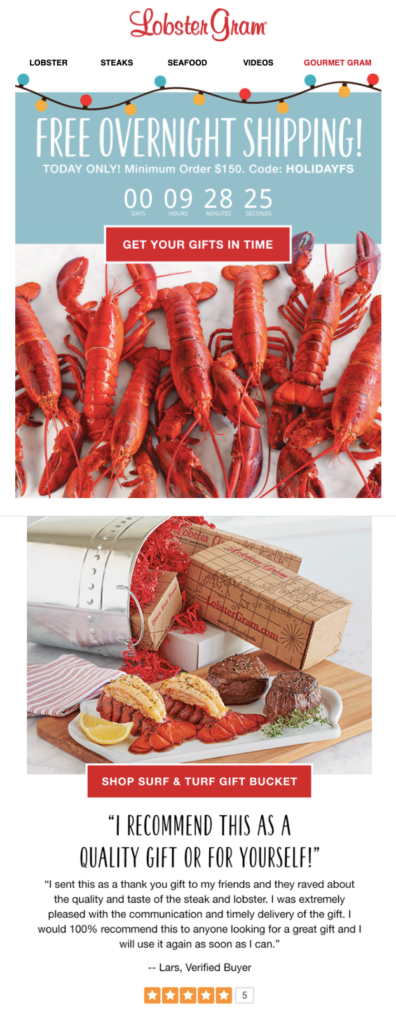 We love this example from LobsterGram because they use the review as the sales copy for a holiday email promotion. This is a super-efficient approach because not only do you save your marketing team the trouble of creating new copy, you probably end up being more persuasive as a result.