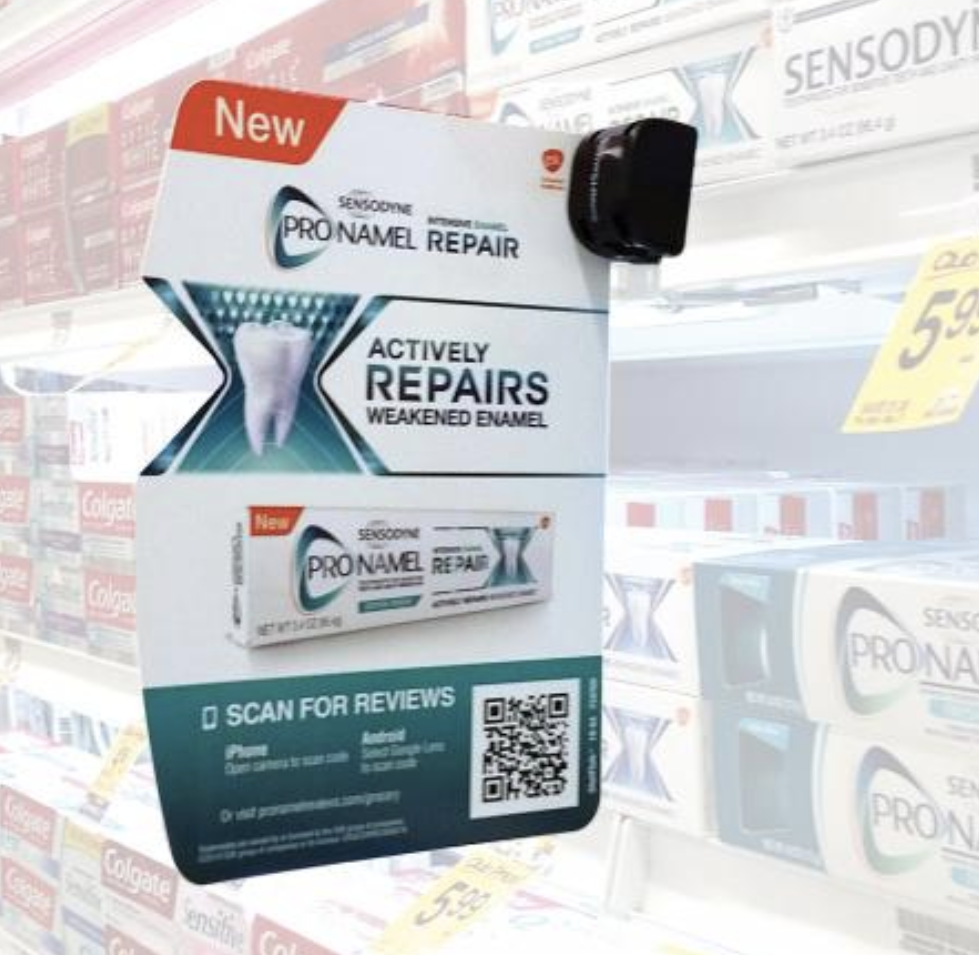 You can only fit so many reviews on a shelf display. Invite shoppers to read more reviews by scanning a QR code. Just follow this example from Sensodyne.
