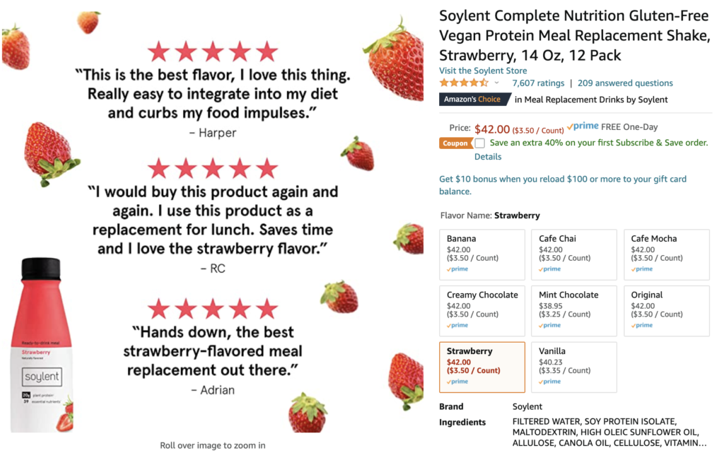 Pop your best reviews into your favorite graphic design tool and transform them into a graphic. You can use them as graphics in your own product gallery as well as on other retailer websites.