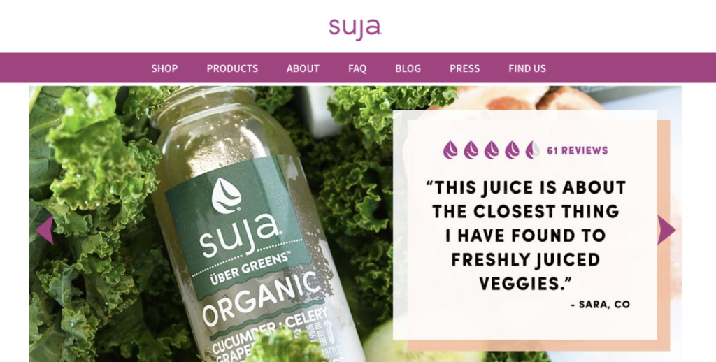 Your customers are generally more persuasive than your marketing team and often talk in blunter terms that are more likely to directly resonate. Take a cue from Suja and highlight snippets from your reviews on the homepage.