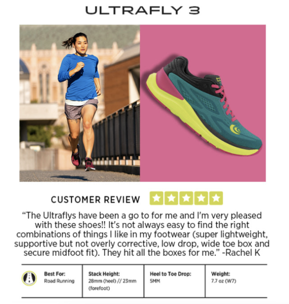 Hook them in with glowing review content, and then provide specific detail to help them identify whether the product is right for them (e.g. key specs like product dimensions or top-rated use cases). Here’s an example from Topo Athletic.